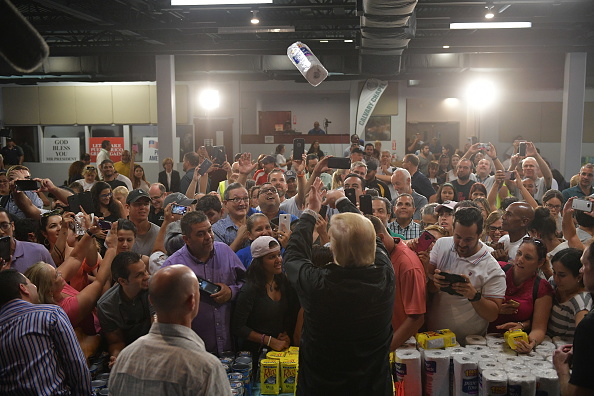 October 3, 2017. President Donald Trump throws a paper towel roll to help distribute relief supplies in Puerto Rico. (Photo courtesy MANDEL NGAN/AFP/Getty Images)